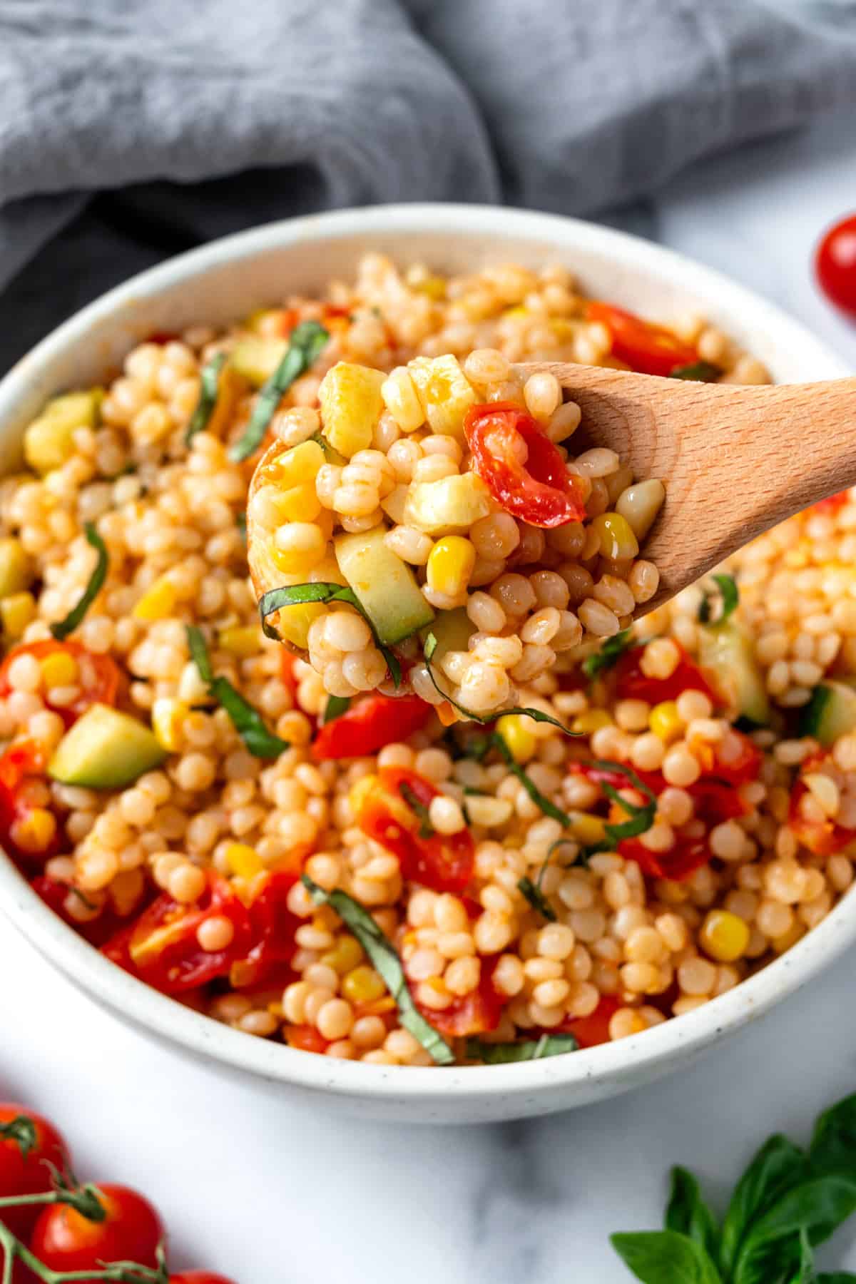 - Mix in the cooked pearl couscous. Stir in the fresh basil. Add a drizzle of extra virgin olive oil, as needed. Taste and season with more sea salt, if desired. Serve warm or cold.